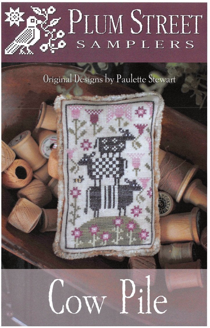 It is one big pileup! These three cows are standing on the hillside, one cow on top of another cow. They are enjoying their lunch by munching on a flower. Beautiful blooming flowers are stitched around the cows. These hungry cows aren't letting a busy bee get in their way! The model was stitched on 36 count Oaken by Picture This Plus, using 1 strand of floss over 2 linen threads