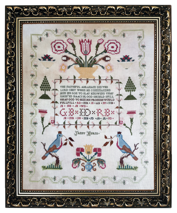 A reproduction of a sampler stitched by Janet Burns