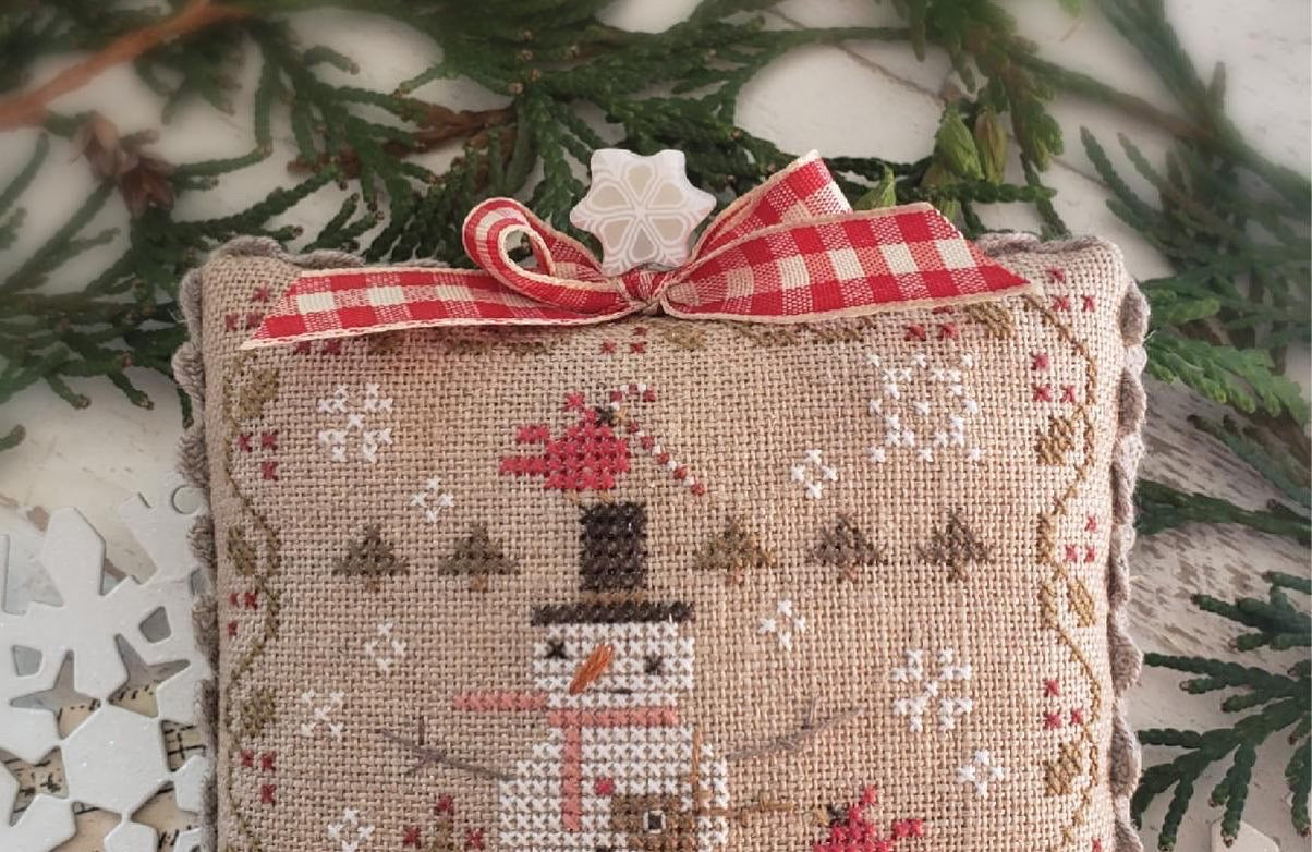 A companion ornament to the Santa Stops Here piece. A simple yet charming finish with the addition of a red check bow and a snowflake pin