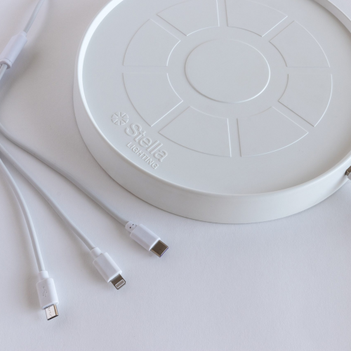 Just like your favorite Stella lamps, the Stella>>GO features tri-spectrum technology, giving the user the ability to change from a warm, natural, or cool light, 10-level dimming, minimal heat, and low wattage consumption. The flexible neck allows for maximum adjust-ability. The charging pad also features a USB charging port with a three prong charger included (USB, USB type C, Lighting cable).