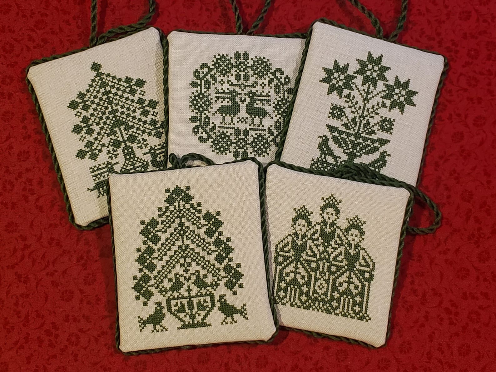 These five ornaments are inspired by the beautiful samplers of Vierlande (literally, "four lands), a region of Germany outside Hamburg. I've reimagined the intricate geometric motifs popular on those samplers and made them into Tannenbäume (Christmas trees), carolers, a potted poinsettia, and a wreath, all accompanied by birds and deer that seem just right for the season. Finish them as ornaments, or make them up as pillows to fill a festive dough bowl this holiday season.