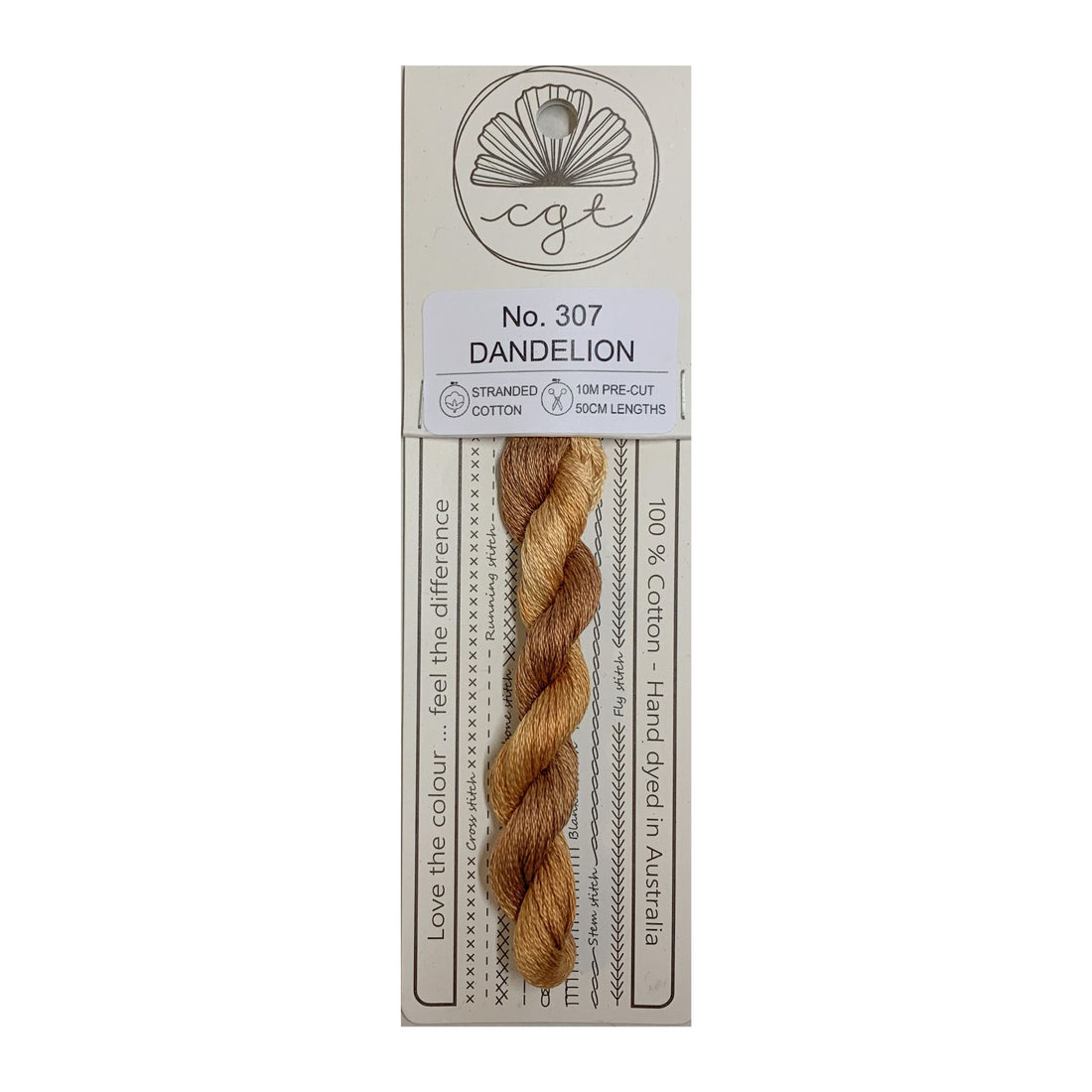 10.9 yards of Cottage Garden Threads pre-cut 6 strand, hand-dyed 100% cotton thread. Floss is colorfast, lightfast and packaged on recycled card stock. Includes storage and floss-care instructions on back of card.