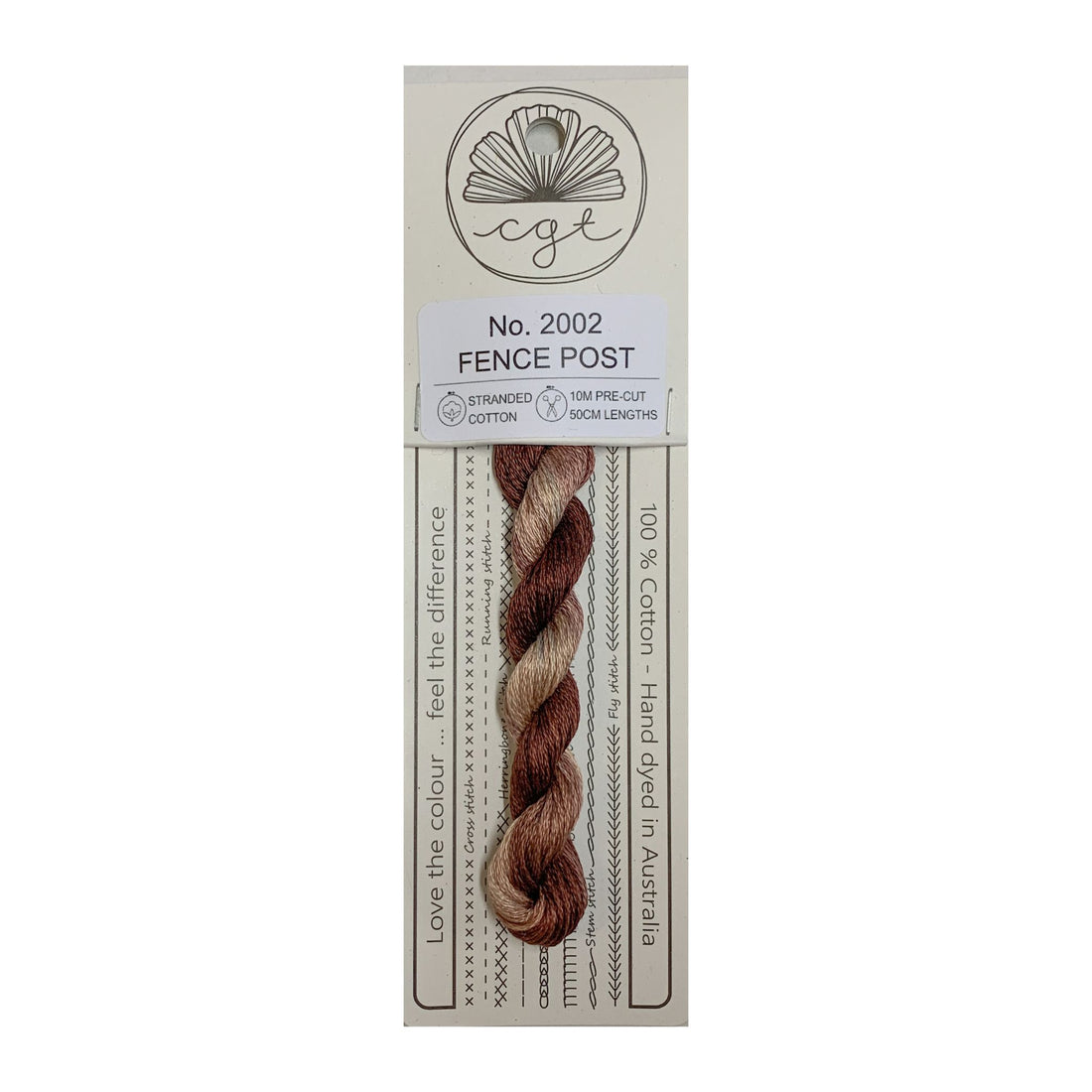 10.9 yards of Cottage Garden Threads pre-cut 6 strand, hand-dyed 100% cotton thread. Floss is colorfast, lightfast and packaged on recycled card stock. Includes storage and floss-care instructions on back of card.
