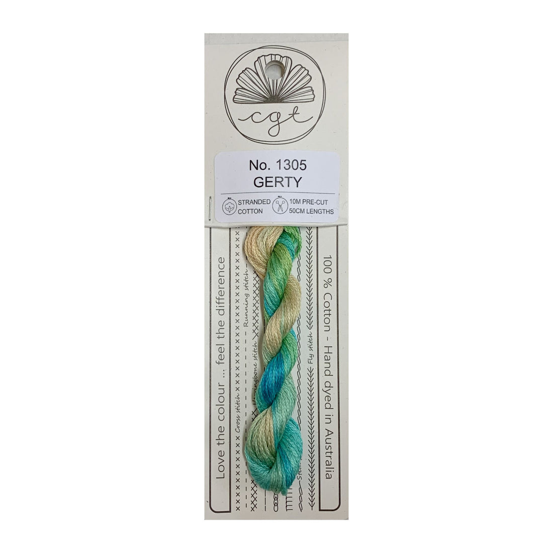 10.9 yards of Cottage Garden Threads pre-cut 6 strand, hand-dyed 100% cotton thread. Floss is colorfast, lightfast and packaged on recycled card stock. Includes storage and floss-care instructions on back of card.
