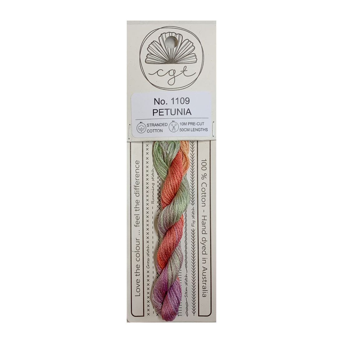 10.9 yards of Cottage Garden Threads pre-cut 6 strand, hand-dyed 100% cotton thread. Floss is colorfast, lightfast and packaged on recycled card stock. Includes storage and floss-care instructions on back of card.