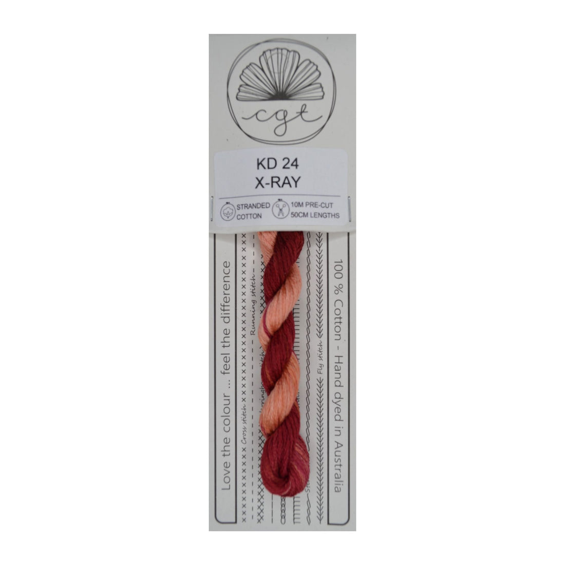 10.9 yards of Cottage Garden Threads pre-cut 6 strand, hand-dyed 100% cotton thread. Floss is colorfast, lightfast and packaged on recycled card stock. Includes storage and floss-care instructions on back of card.