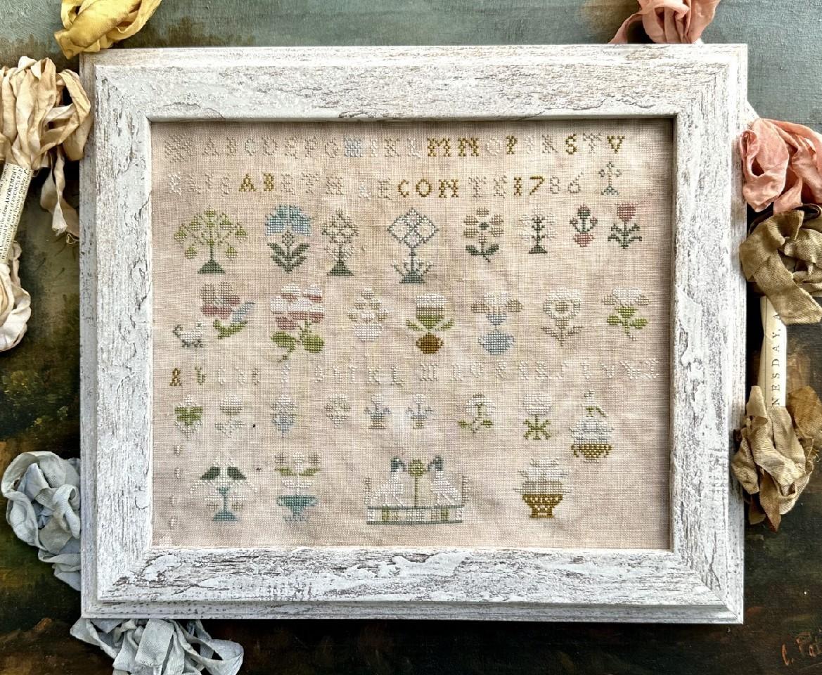 Elisabeth LeConte, 1786 is a reproduction of an antique sampler found here in Maryland. This was a teaching piece at the 2023 Sunshine Stitchers Retreat in Florida last spring.