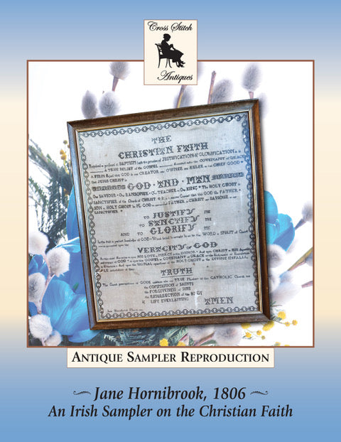 Provenance: No clues have been provided by the stitcher as to her name, year of origin, or place where she stitched her sampler. The only clue as to place might be in the lettering she used itself, giving one an indication it was stitched in Ireland. “A slightly surprising source of lettering which became identifiable on Irish Quaker school samplers, came to be known as the Benezet lettering. Anthony Benezet (1713-1784) came of a Huguenot family that emigrated to London in 1715 to avoid the persecution that followed the revocation of the Edict of Nantes, and then settled in Philadelphia, where he became a Quaker and an important educator. He produced the “Pennsylvania Spelling Book” which was widely used in Ireland where a sixth edition was printed in Dublin in 1800 by John Gough, the son of the schoolmaster. Benezet's 1782 revised edition, in addition to the standard Roman alphabet, contained a page of “sampler letters' for embroidery and this served as a model for letters on samplers, both Quaker and non-Quaker, which was much more popular in Ireland than in the rest of the British Isles. This Benezet lettering was already in use by 1790 at Mountmellick Quaker school and would later appear in the non-Quaker Kildare Place work.” Samplers, Sewing and Simplicity in Quaker Ireland, Clodagh Grubb, pg. 123-124.