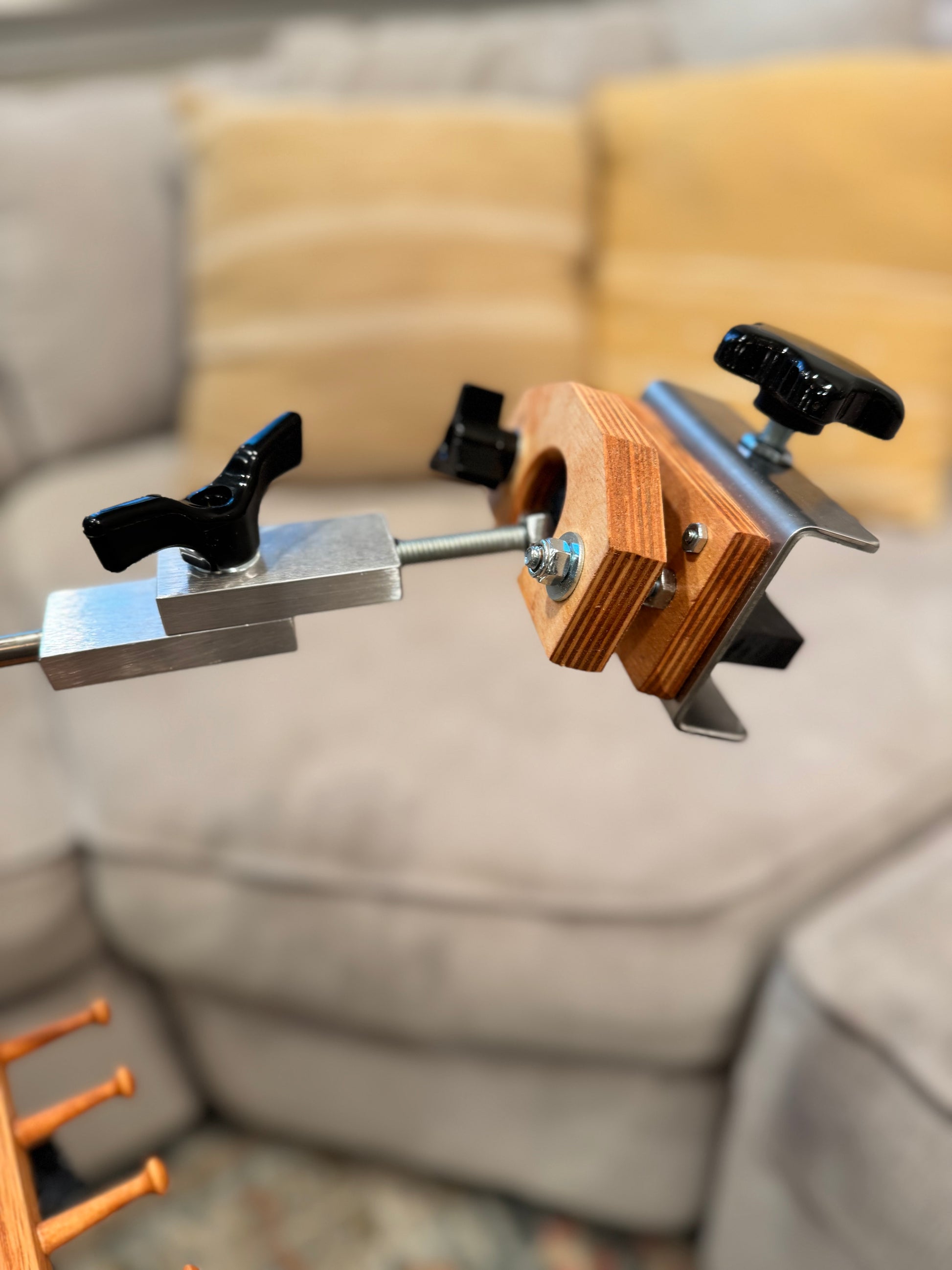 Adjusts 20"-37" tall, locks at 90°, adjustable arm, 360° rotation, plus accessory tray. Disassembles into 3 pieces plus tray for storage/travel.