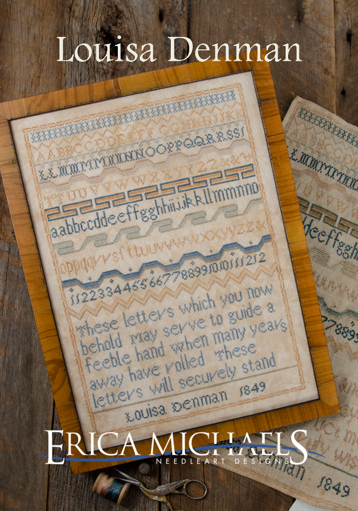 A marking sampler reproduction featuring an optional verse, this is part of my marking sampler series and includes another collectible full-color alphabet card. Louisa used a soothing color palette with interesting dividing bands - it's a unique and lovely sampler.