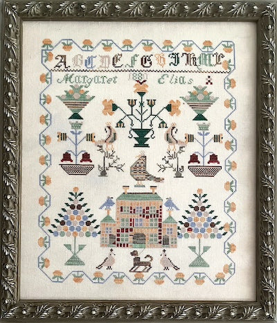 Margaret Elias is a colorful sampler with a patchwork house and trees. This unusual sampler is a joy to stitch.