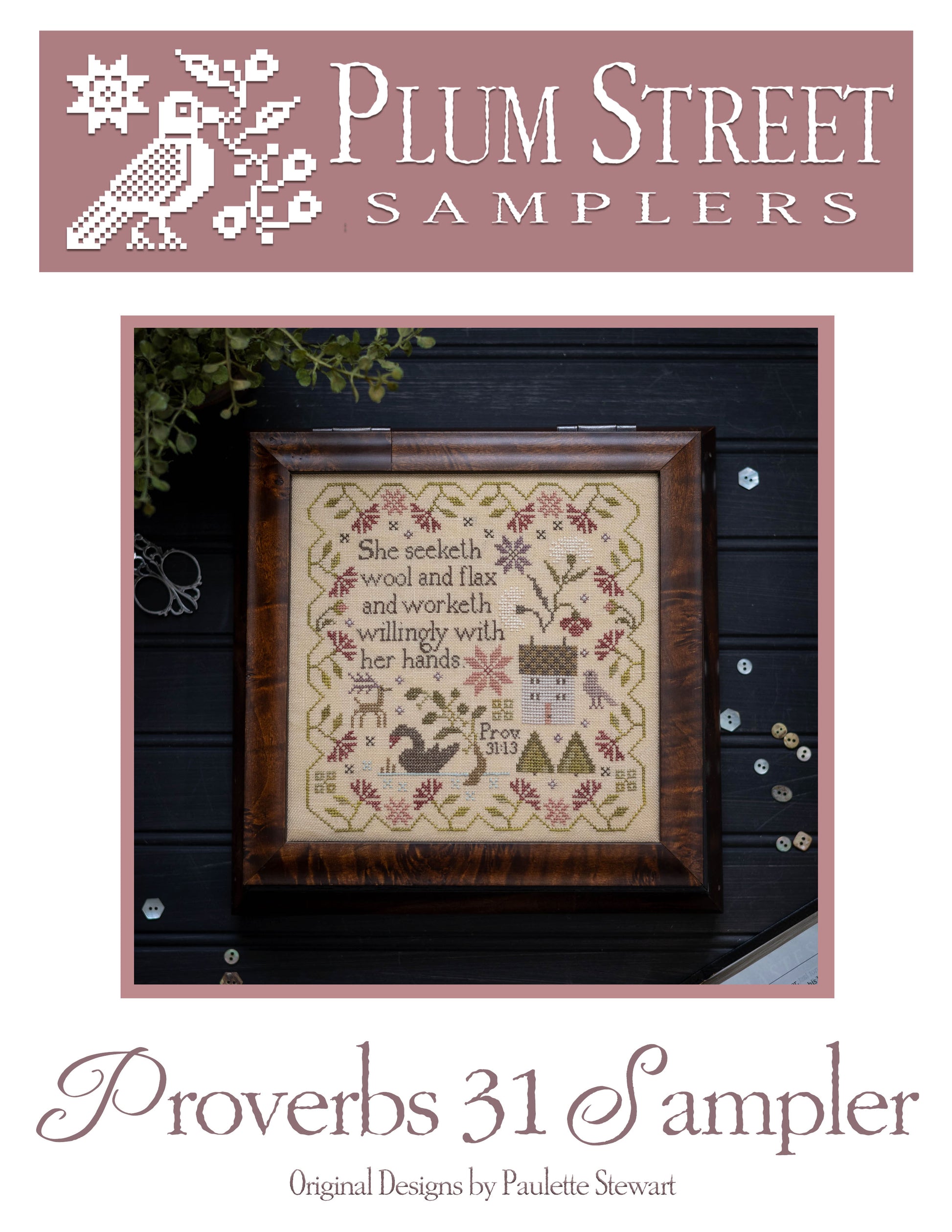 Proverbs 31 was written from a wise mother to her son, teaching him what to look for in a spouse. The feminine color palette was very pleasant to work with, and I truly hope stitchers find it relaxing as they "work willingly with their hands." The design can be framed or finished into a 7"x7" cushion, but this model has been mounted into a beautiful box from Olde Colonial Designs. It would make such a perfect sewing box, given the verse. (If framed or finished into a pinkeep, it would be so sweet displayed in a sewing studio or favorite stitching spot.)