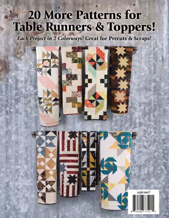 Tabletastic! 3 is the 3rd and final of a Trio of Table Runner and Topper Books. 20 New Table Runners and Toppers patterns - 14 Table Runner & 6 Toppers Each Project shown in 2 Colorways! Great for using up your Precuts & Scraps! (10" Square, 2.5" Strip, 5" Square F8, and FQ friendly patterns). The full color book also comes with a metal spiral binding, it will lay nice and flat while you use it.