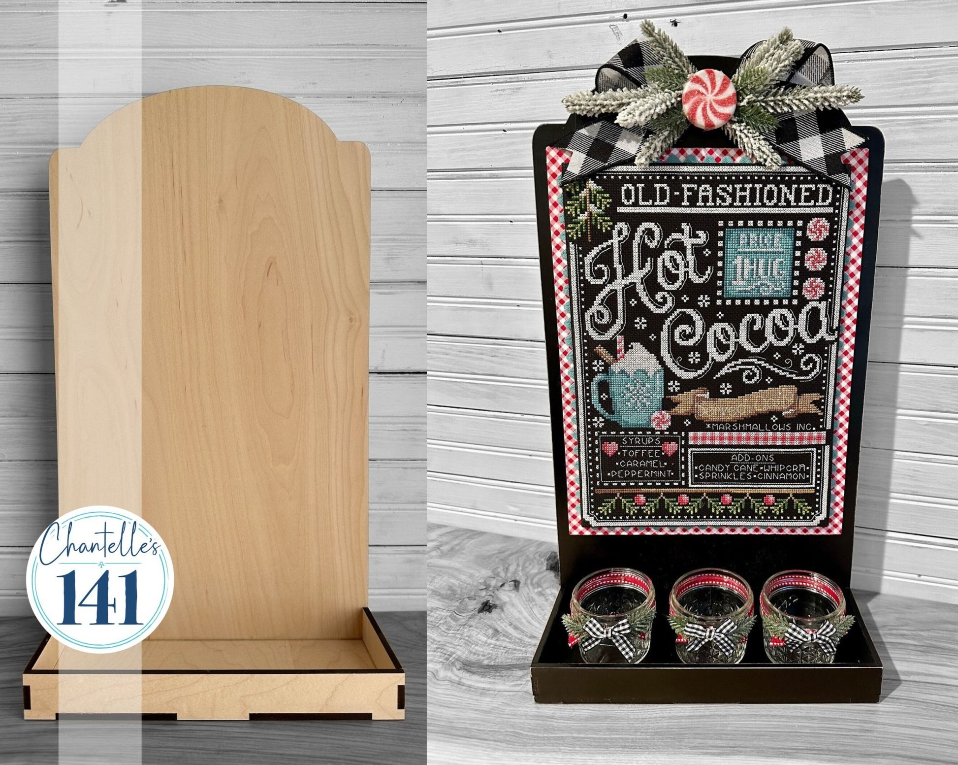 Unfinished cross-stitch, needlework or photo display item. This item is laser cut using 1/4" maple veneer. Item has five pieces. Some assembly required. We recommend using a quick set wood glue when building this display piece.
