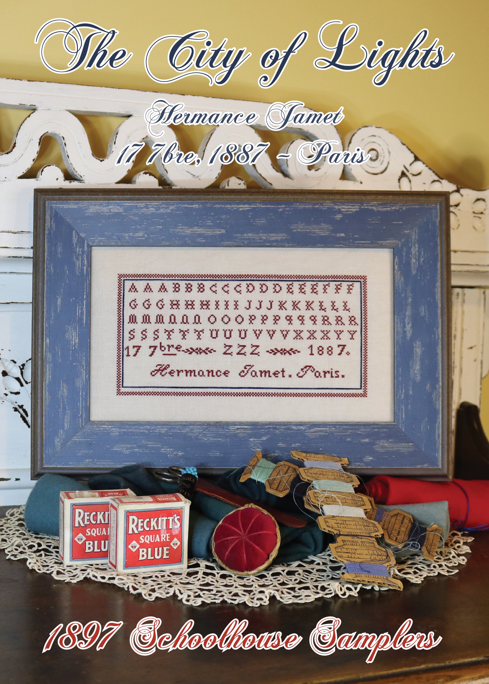 Instructions: The model was stitched with 2 strands of over-dyed floss, over 2 linen threads. Using an eyelet stitch, work the periods that appear after “Jamet” and “Paris” using WDW Red Rocks. The model was stitched without the extra inside border, but they have been included in the enclosed chart should you wish to include in your piece.
