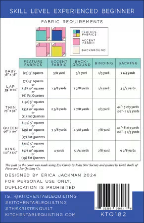 The Kristen Quilt Pattern is a versatile and fun project designed for experienced beginners and beyond. Whether you’re using charm squares, layer cakes, fat quarters, or scraps, this pattern helps you showcase your favorite fabrics beautifully. With instructions for five sizes—baby, lap, twin, queen, and king—it adapts to any quilting need. The Kristen Quilt easily transitions from a traditional look to a modern aesthetic, making it a perfect choice for a wide range of fabric styles. This pattern is sure to inspire creativity and make your next quilting project a joy! Sizes Baby Size - 38" x 38" Lap Size - 59" x 66" Twin Size - 73" x 94" Queen Size - 96" x 110" King Size - 110" x 110" Skill Level Experienced Beginner